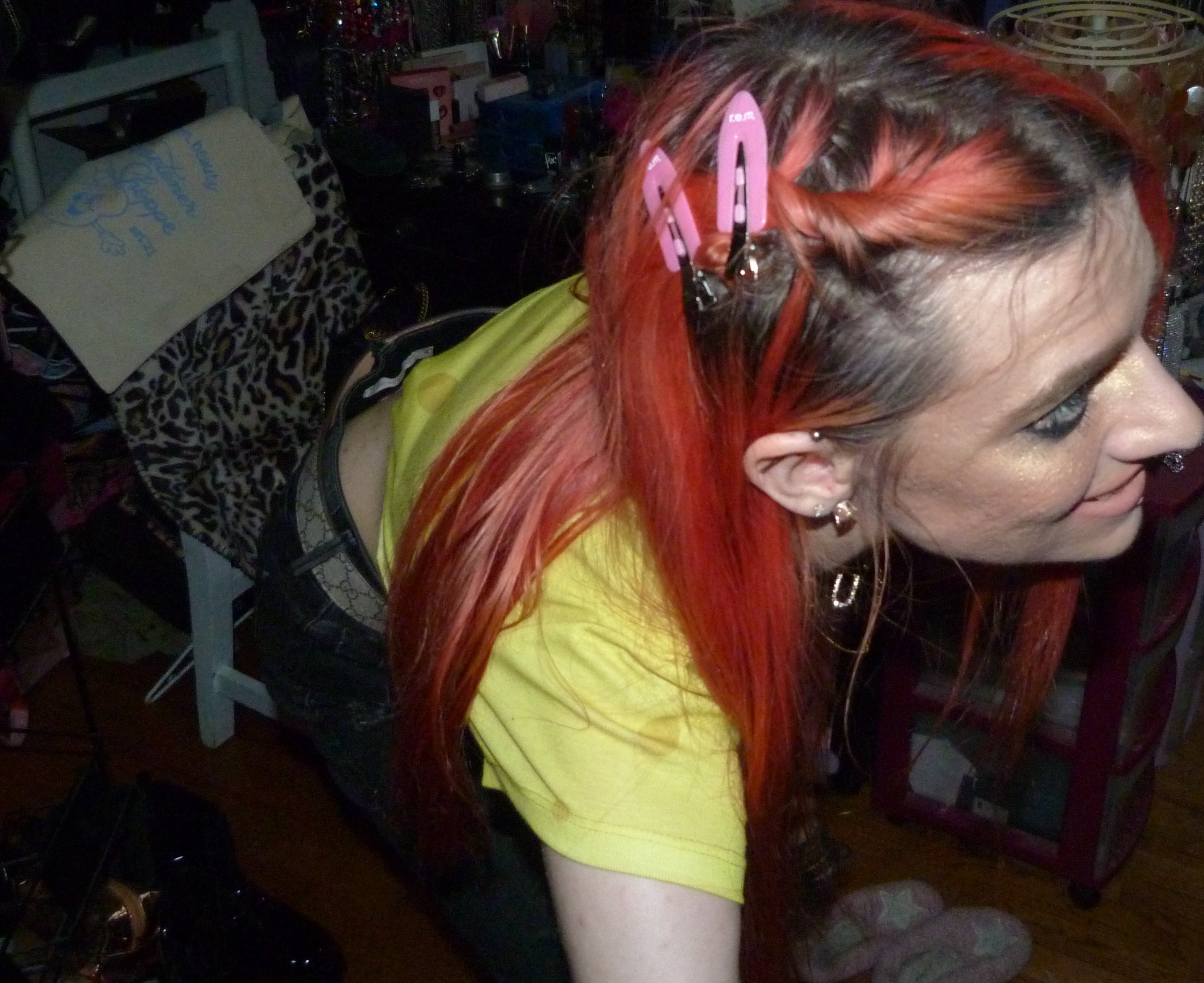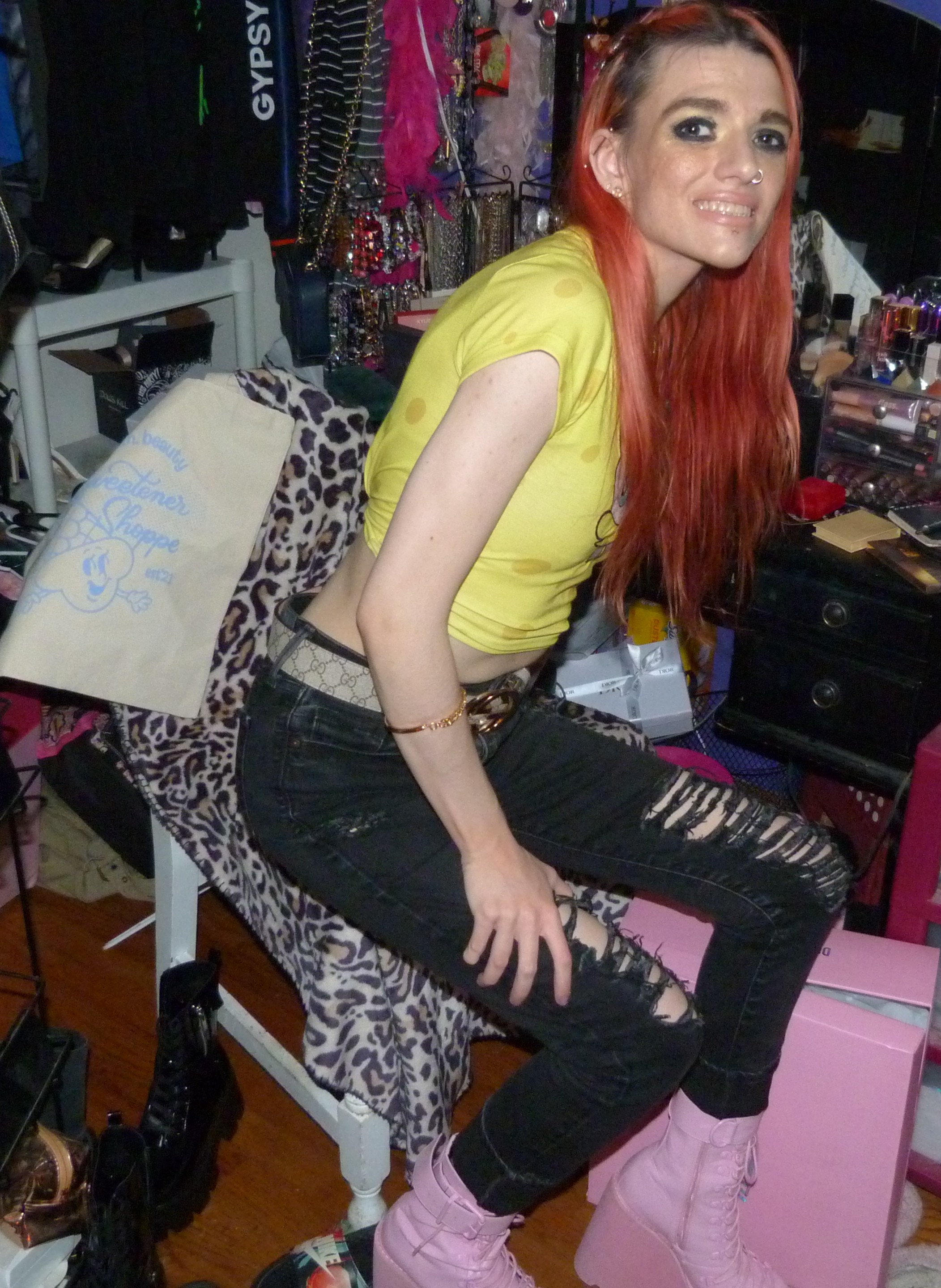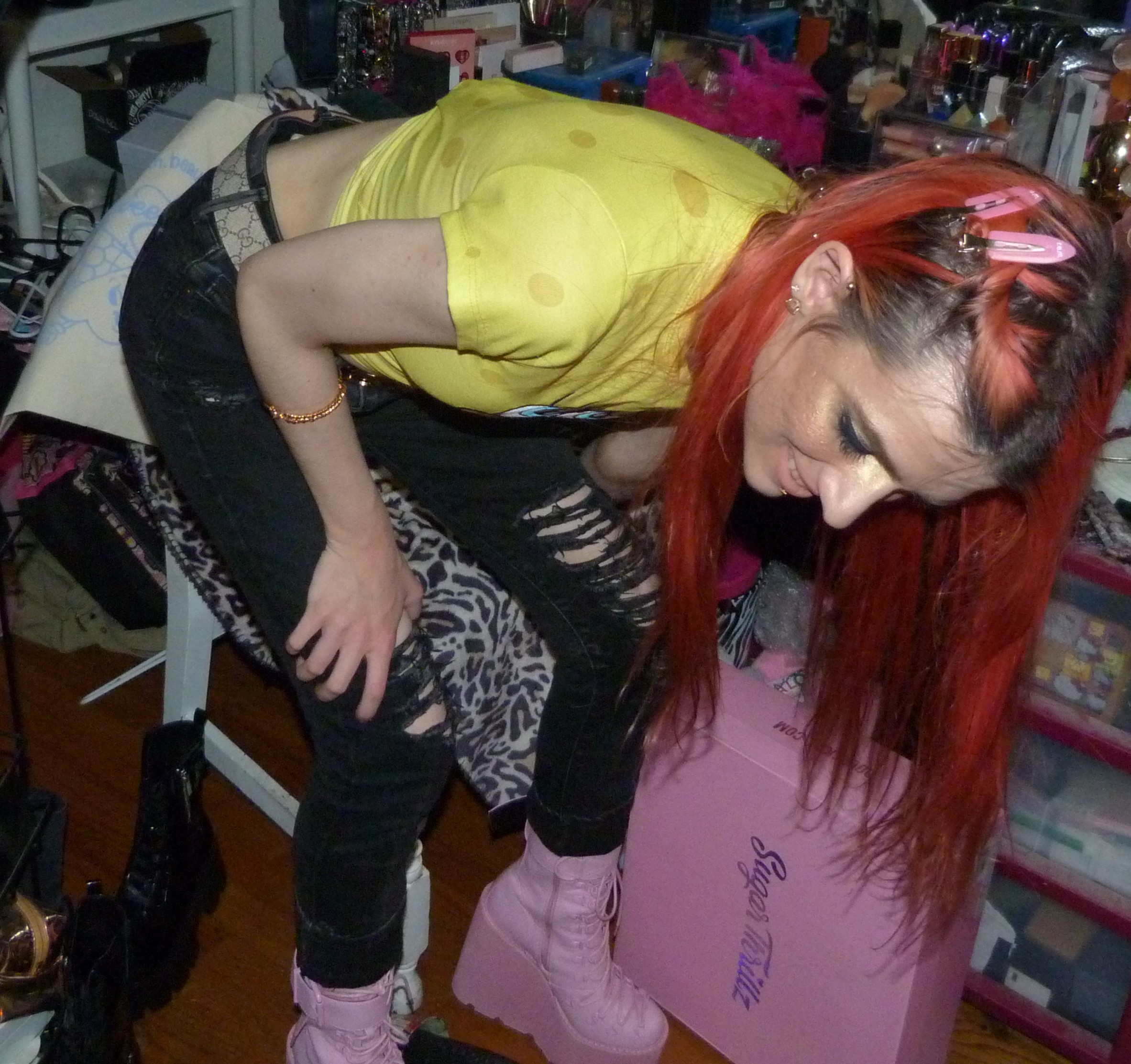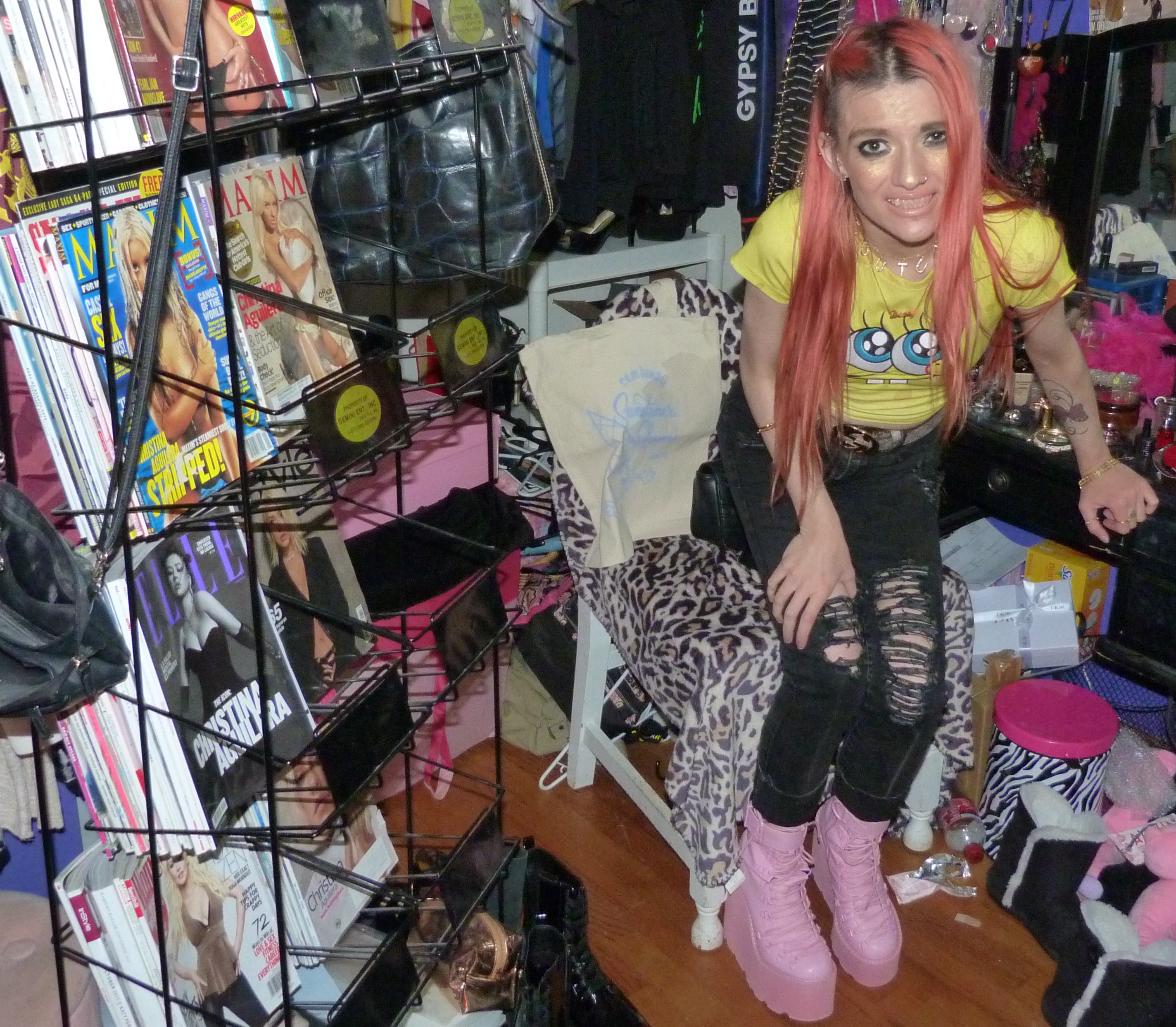 SPONGEBOB SQUAREPARENTS! Peach hair with Ariana Grande REM x2 hair clips, Daddy necklace, new Dolls Kill Bubblegum Traitor Boots that I just bought & a Dolls Kill x SpongeBob Collection Top!