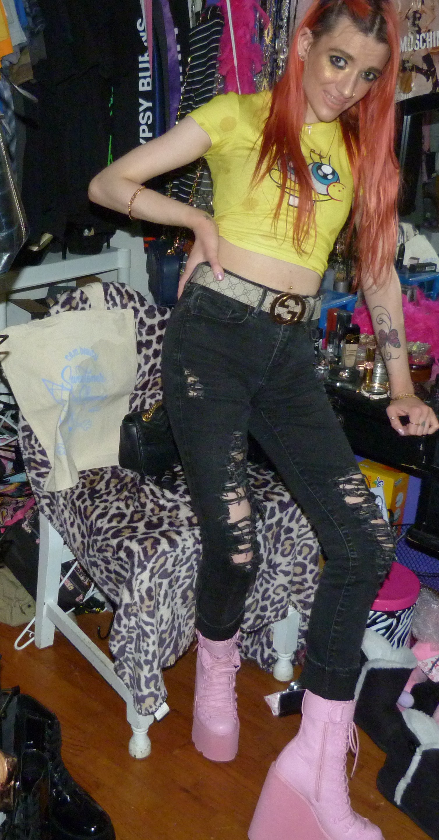 *I ended up doing this shoot at the last second with faded peach-colored hair, without my extensions for the first time since last summer! I was so shocked about that & I waited until the last second then couldn’t wait any longer to get any more red hair dye. I’ve just been so emotionally busy lately like so I totally couldn’t dye my hair in time! So it’s literally an unexpected peach colored hair photoshoot that went with the outfit perfectly. Oh well, it’s cool to do my natural hair this time unexpectedly! It is the peach hair with the Ariana REM hair clips that I just bought! Let’s get into the cute SpongeBob outfit.