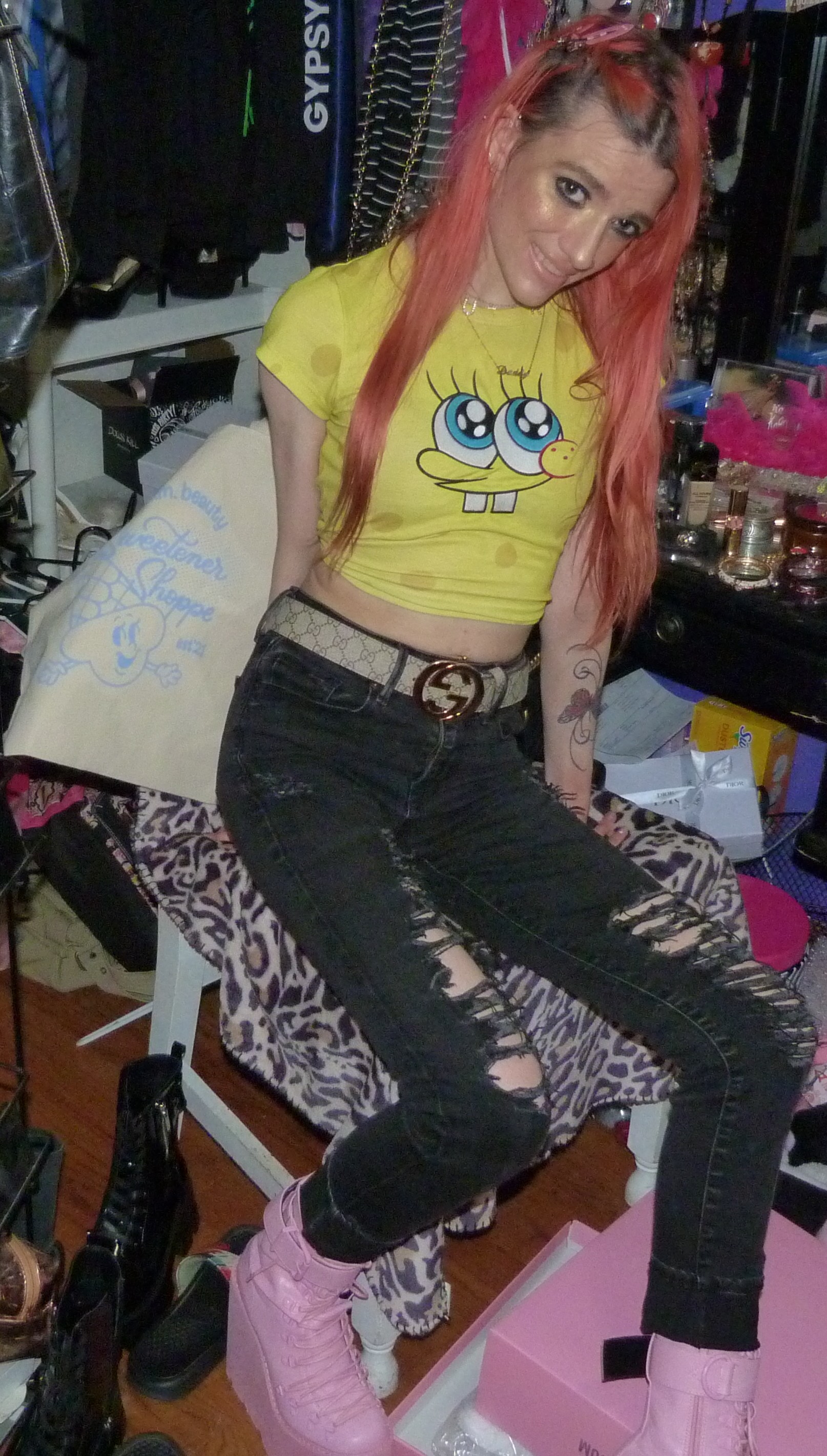 This SpongeBob shirt is so awesome. SpongeBob was my all-time favorite show for a lot of my life, it’s significant. I’ve always been really into Dolls Kill, since 2019 & I’m always buying from there. Keeping up, since it is my favorite clothing store, of all time! I was super happy when they came out with a few collections that I really loved that were perfect for me, including SpongeBob, was literally, my favorite show of all time. I was the biggest fan of it of all-time, I watched it all the time constantly, when I was like 17, non-stop! It’s still one of my favortie Abby-shows of all-time, it was made for me! So & like my favorite online clothing store of all time that I have always religiously bought from since like, 2019 did this SpongeBob Collection coincidentally for me too, in 2023 & I was so super happy about that! I love cool clothes & I love how cool Dolls Kill is in general, they’re so perfect & also made for me too! I can’t believe how perfect that is. I always blog about Dolls Kill, it is so cool they did my favorite show too! I got this shirt back in September of 2023, but I was finally able to shoot it, this time! I am super happy about that, I actually was behind on shooting new clothes for a while but like, finally caught up! I still haven’t even watched TV much at all since 2021, that was when I stopped watching TV, pretty much & I haven’t watched a lot since then, but I always really loved SpongeBob a lot! Along with a couple other shows pretty much. I love when I see merch, like this though & I love the sexualization of culture like, with TV but also in other things, in media or popular or things, that I like. I love when things like that happen because I’m so cultured from my life all my life & I love things like this because it’s like cool or smart! I’m really into pop music too & different music things, especially that a lot lately though too & so that’s usually what I love & focus on these days, but I have always loved SpongeBob. I think it’s very cultured to me, mostly but it is awesome & it was seriously my show! I love that I finally did this shirt with the cute name & song that went with it, I thought that was cool with the Ariana cover to this one since I’ve been so into her lately. I’m going to do more Ariana-inspired shoots soon I’m excited about!