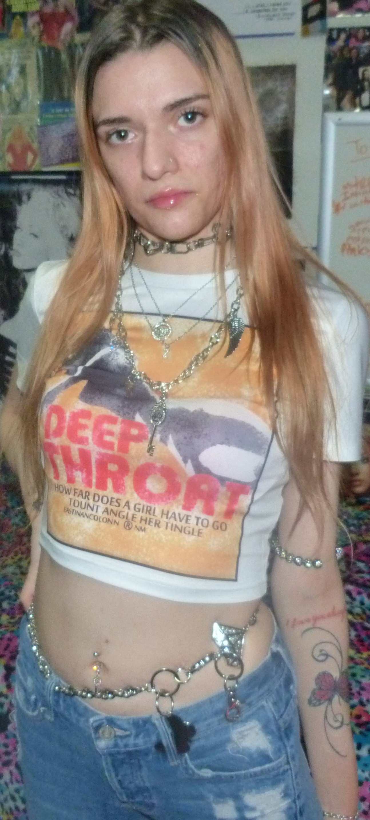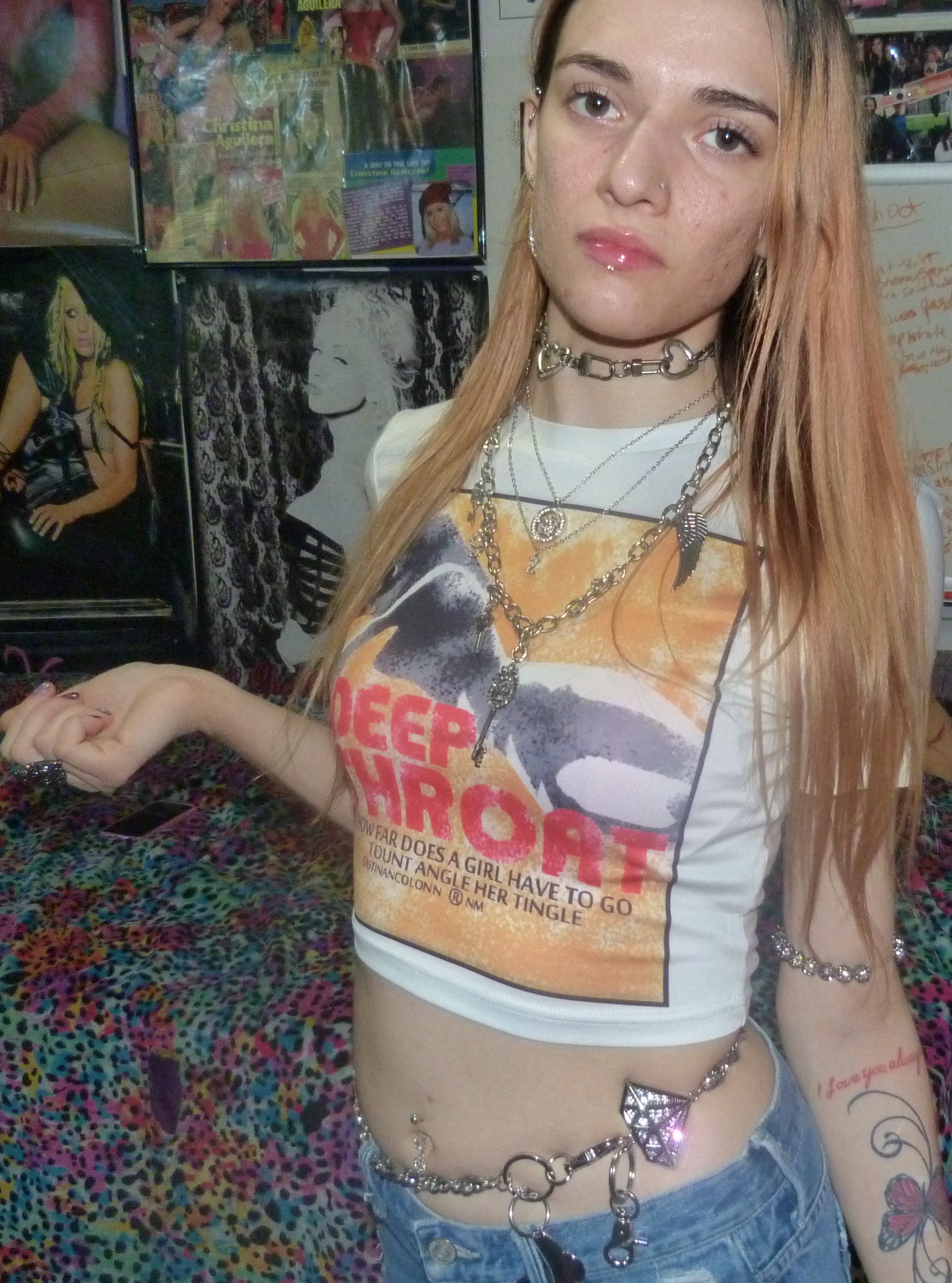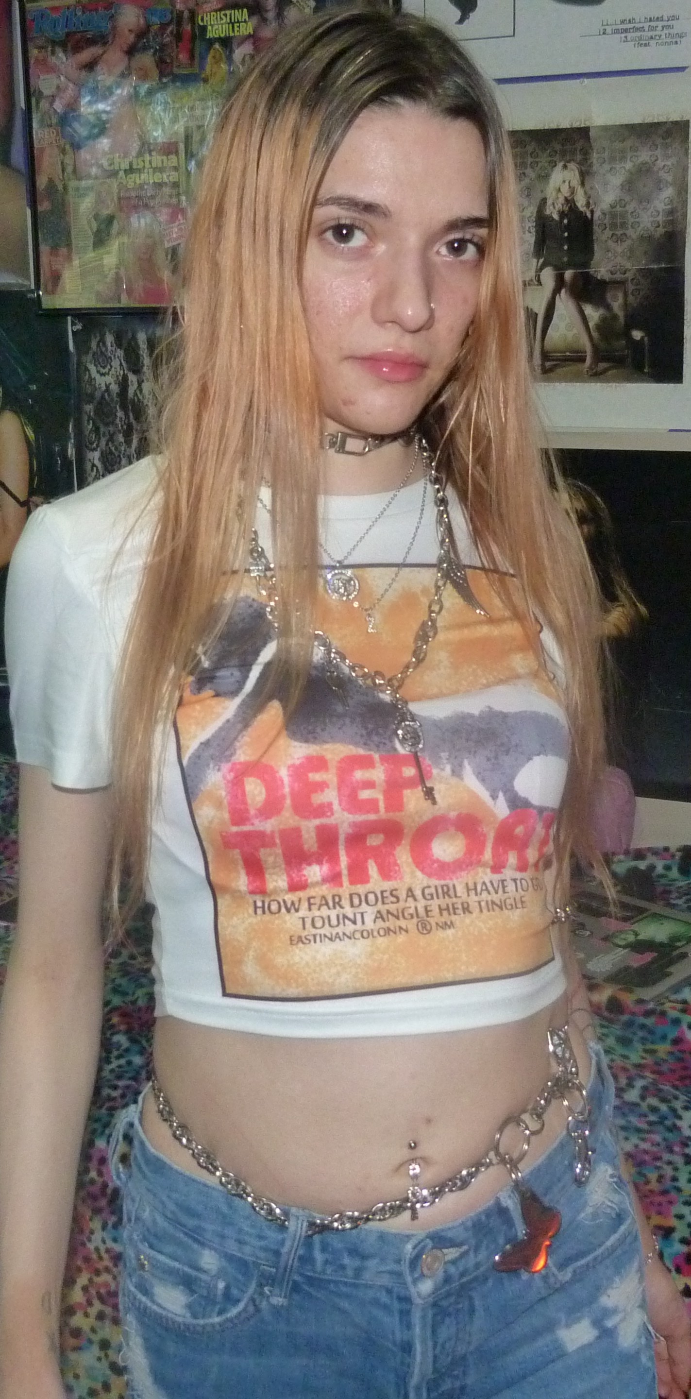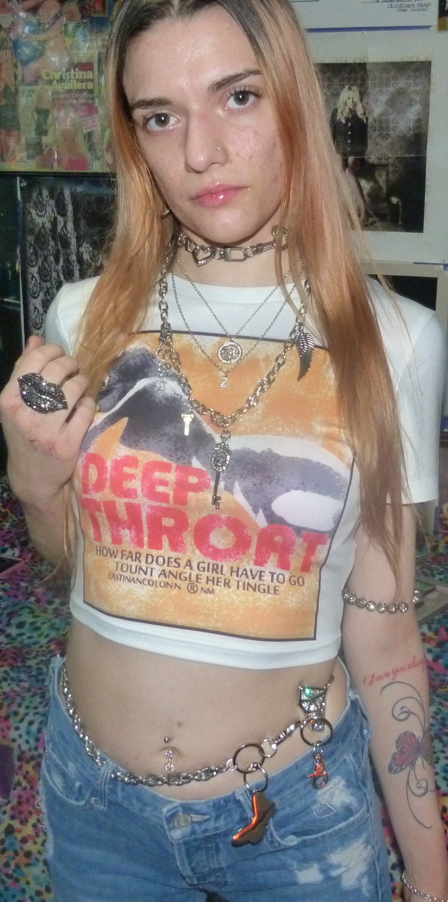 YES, I’m finally doing this cute white crop top that I got that says DEEP THROAT on it! Under that, it says ‘How far does a girl have to go tount angle her tingle?’ which is totally awesome. I love this shirt I got from Kollyy so much, inspired by Christina Aguilera’s 2004 giraffe deep throat t-shirt that I really badly wanted! This is a hot shirt, love it + I’m glad I found this one at least. It looks really cute on me, with my finally blonding hair! That’s super cool plus my silver jewelry + lip gloss. I really love this top!