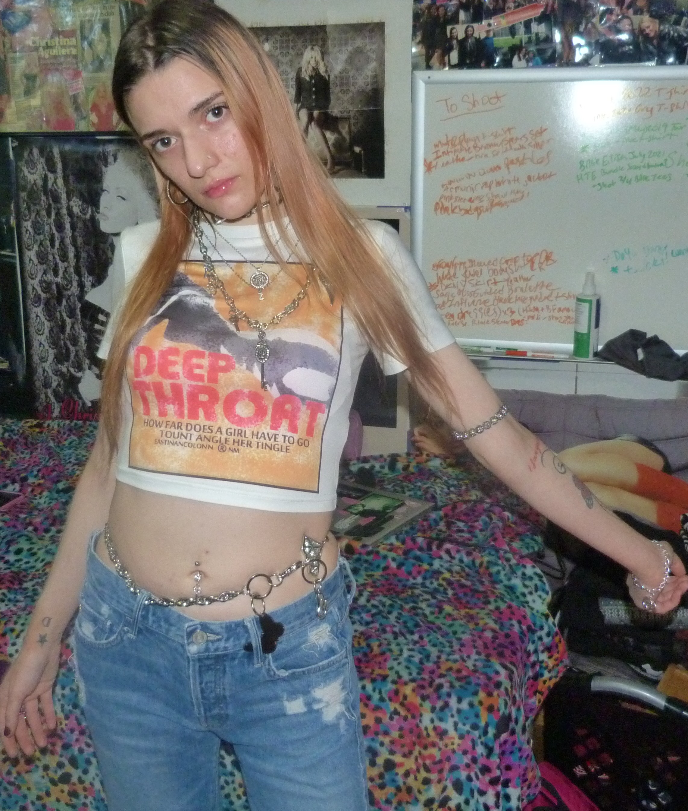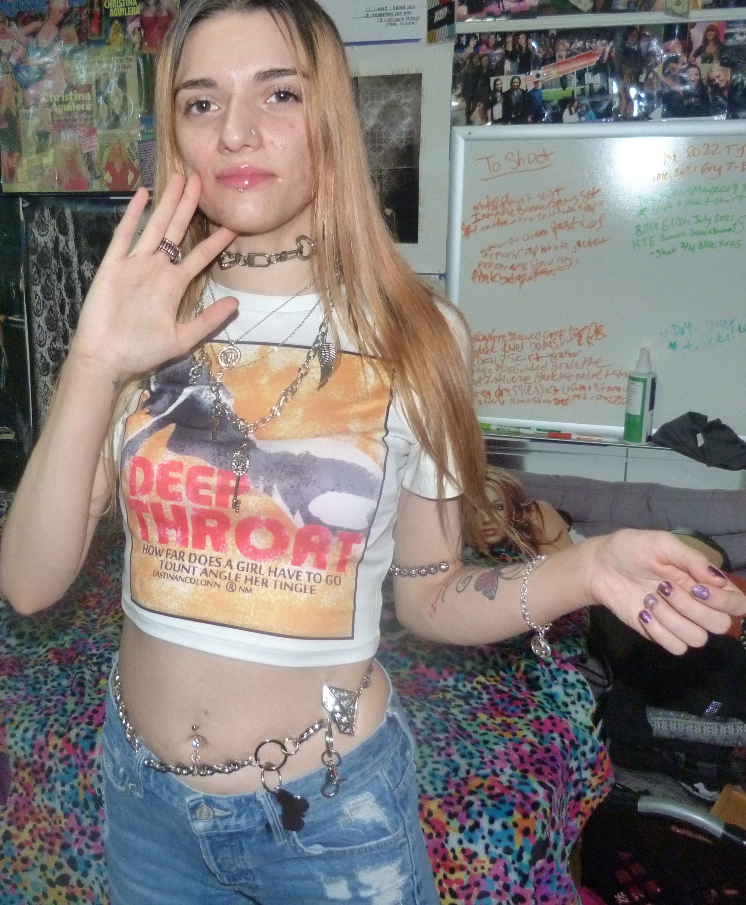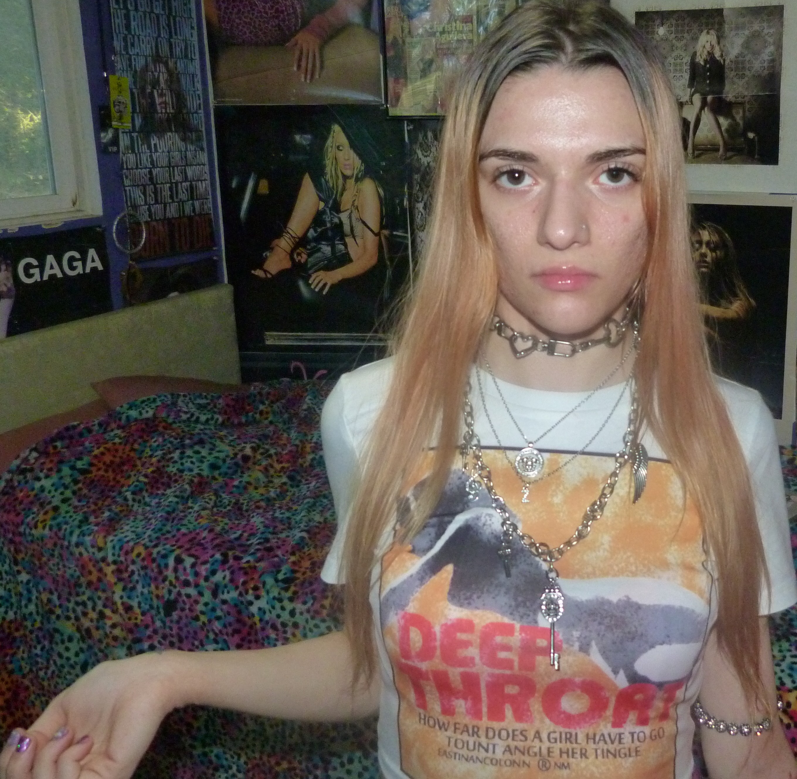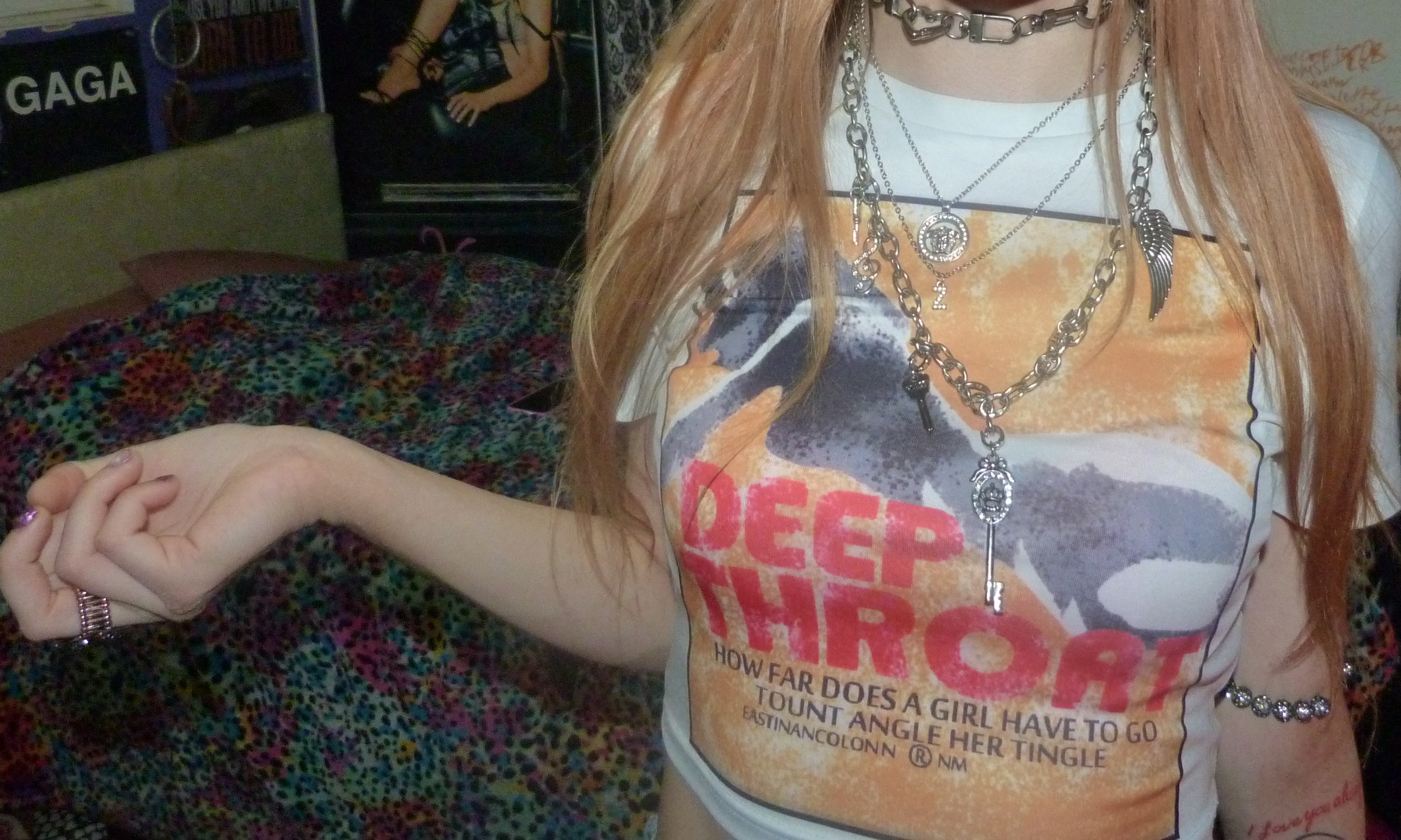 YES, I’m finally doing this cute white crop top that I got that says DEEP THROAT on it! Under that, it says ‘How far does a girl have to go tount angle her tingle?’ which is totally awesome. I love this shirt I got from Kollyy so much, inspired by Christina Aguilera’s 2004 giraffe deep throat t-shirt that I really badly wanted! This is a hot shirt, love it + I’m glad I found this one at least. It looks really cute on me, with my finally blonding hair! That’s super cool plus my silver jewelry + lip gloss. I really love this top!