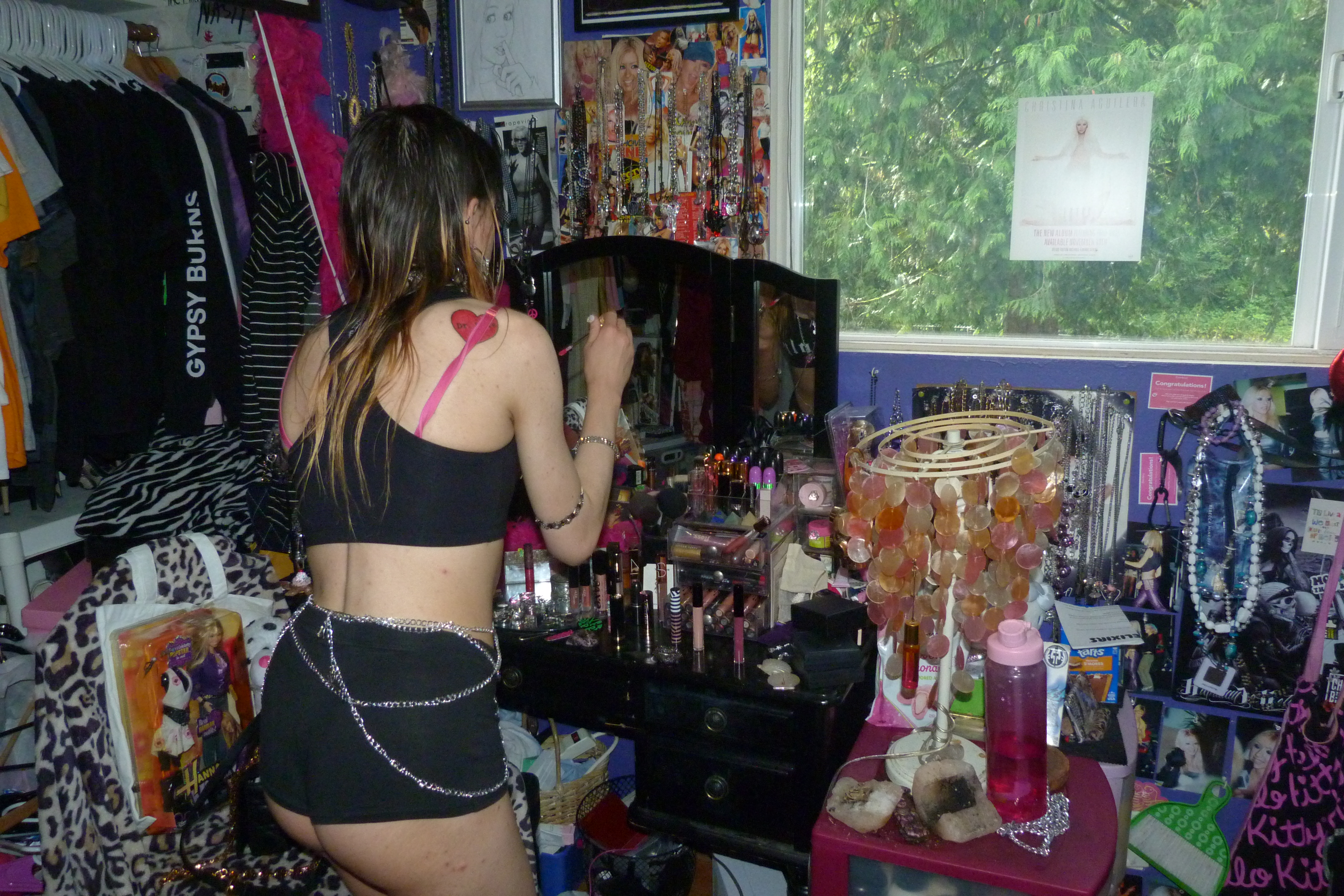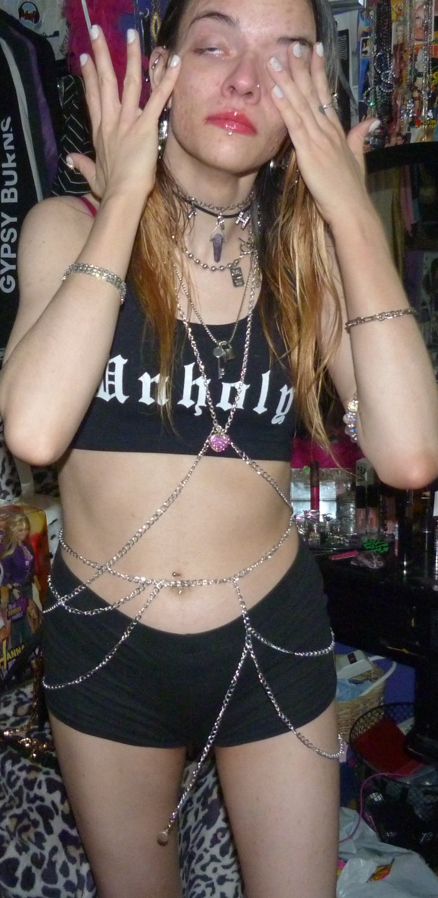 MY FRIEND ZOEY HAD THIS COOL OUTFIT SHE PUT TOGETHER ON A MANNEQUIN, AND SHE GAVE IT TO ME THE OTHER DAY! IT IS AN UNHOLY BRALETTE WITH BOOTY SHORTS/CHAINS.