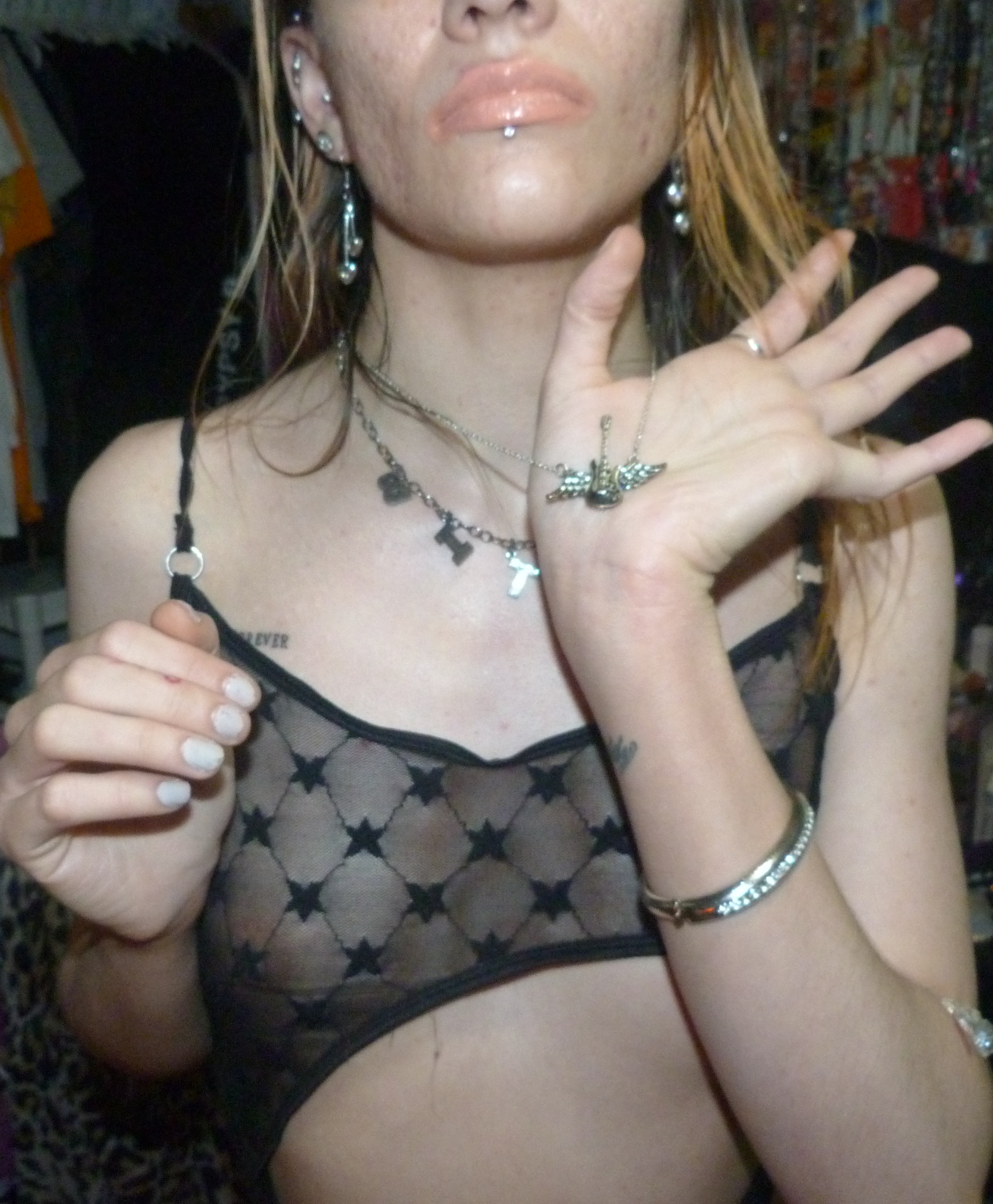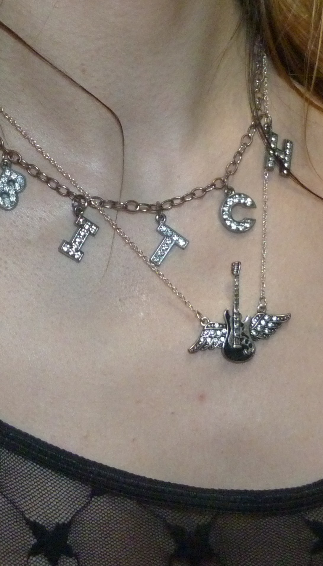I USED CARNATION LIPSTICK BY GUCCI BEAUTY ON MY LIPS + IT LOOKS SO GOOD WITH THE BODYSUIT. PLUS MY NECKLACES WERE A BITCH ONE + MY HANNAH MONTANA GUITAR ONE!