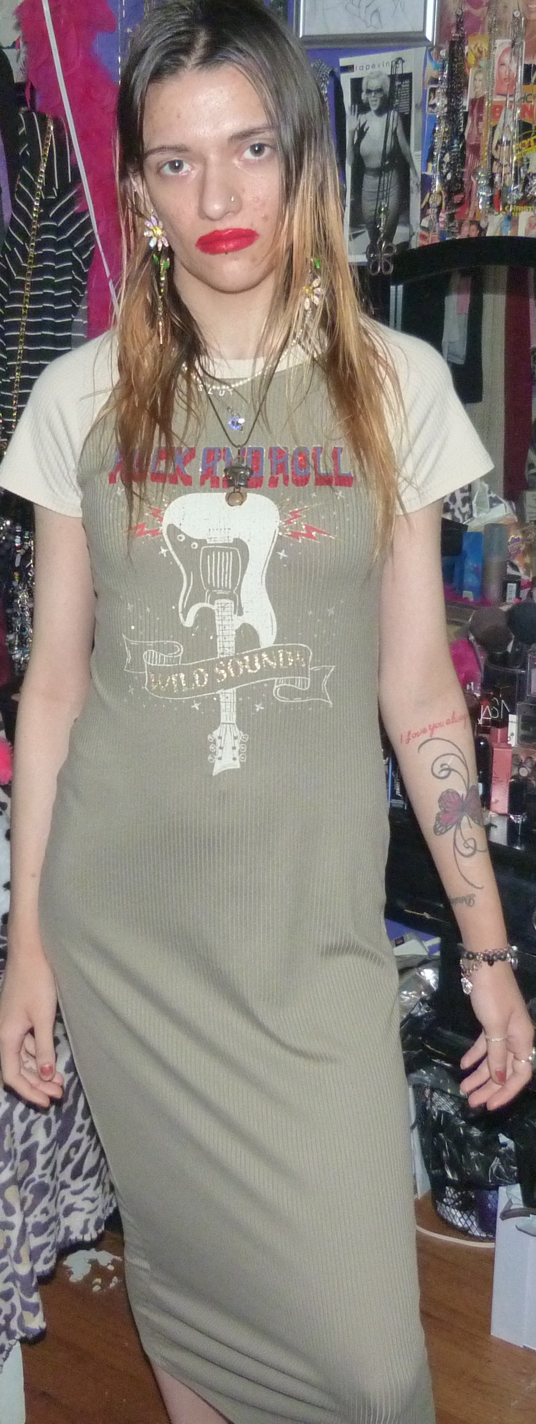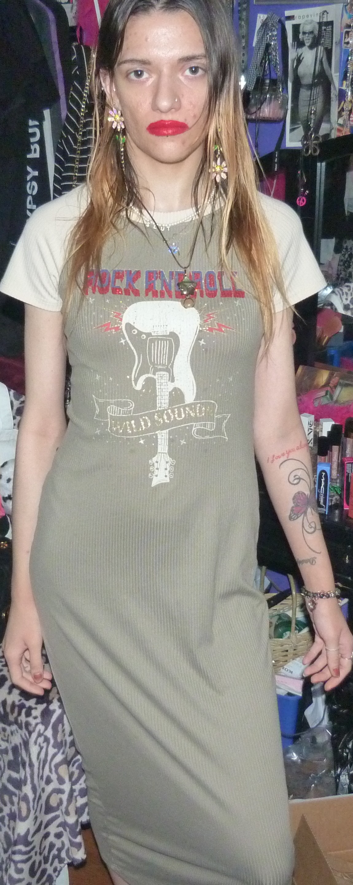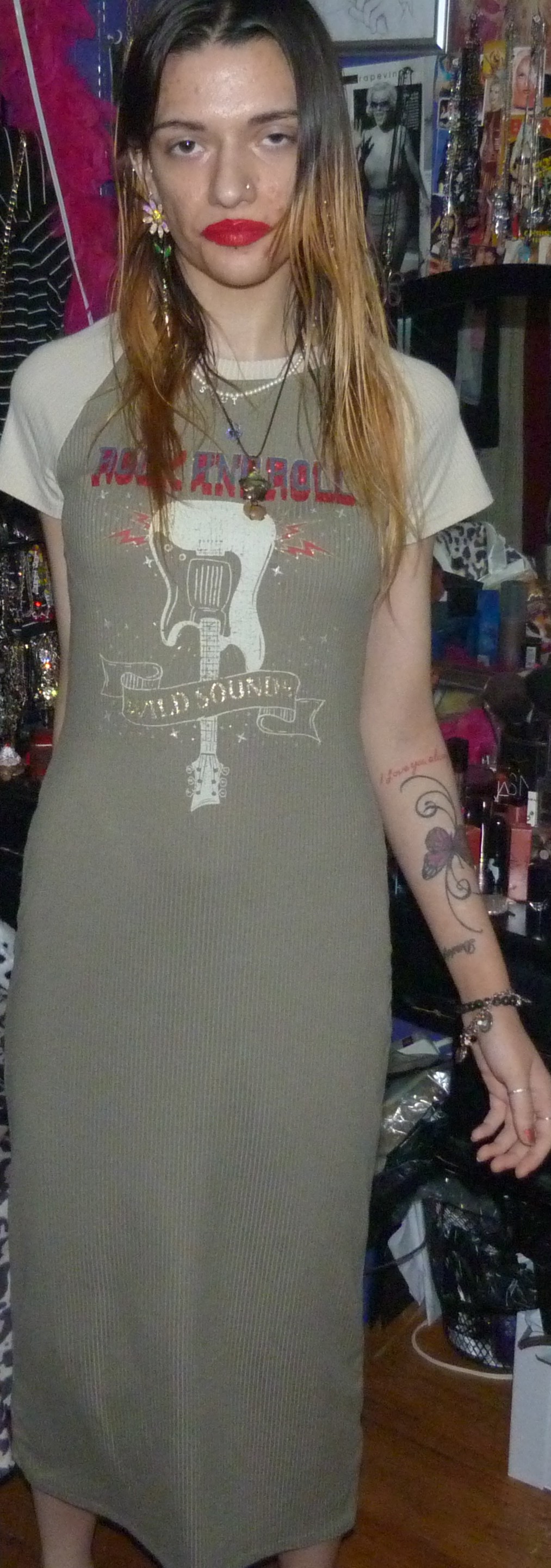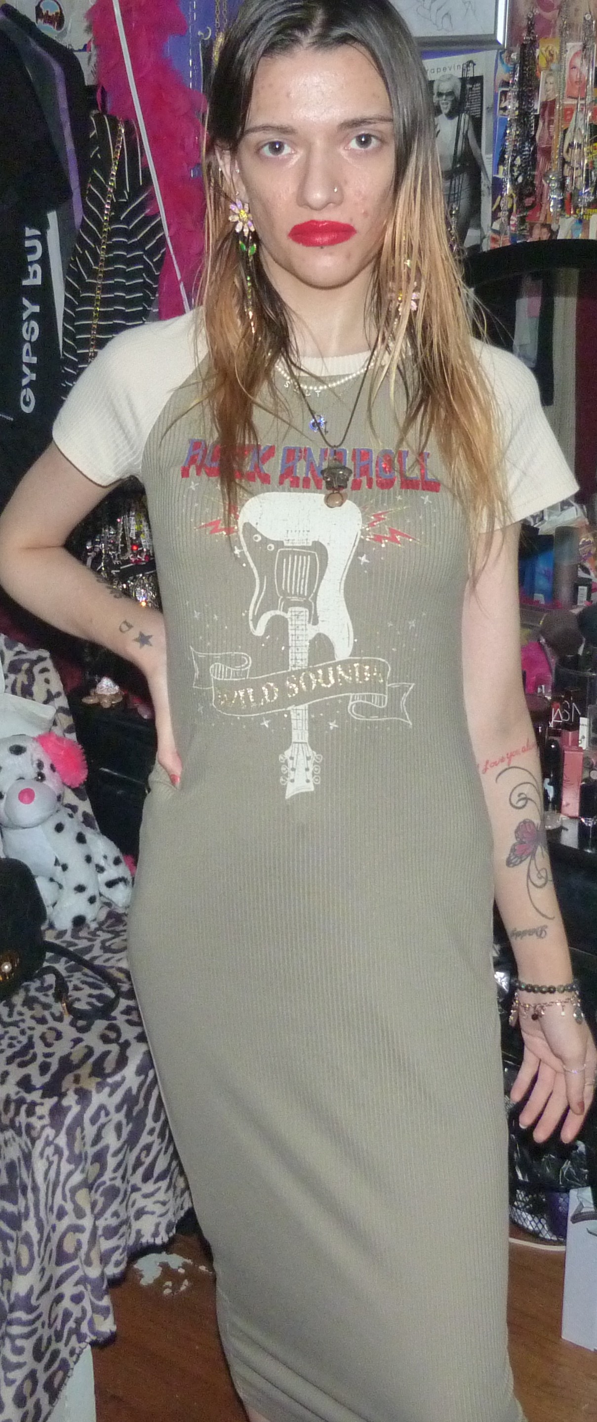 I GOT THIS CUTE MAXI-DRESS ON DEPOP, ANOTHER ONE FROM THE BRAND NO COMMENT! THIS IS A CUTE T-SHIRT DRESS THAT SAYS ROCK AND ROLL & WILD SOUNDS/GUITAR, ON IT.