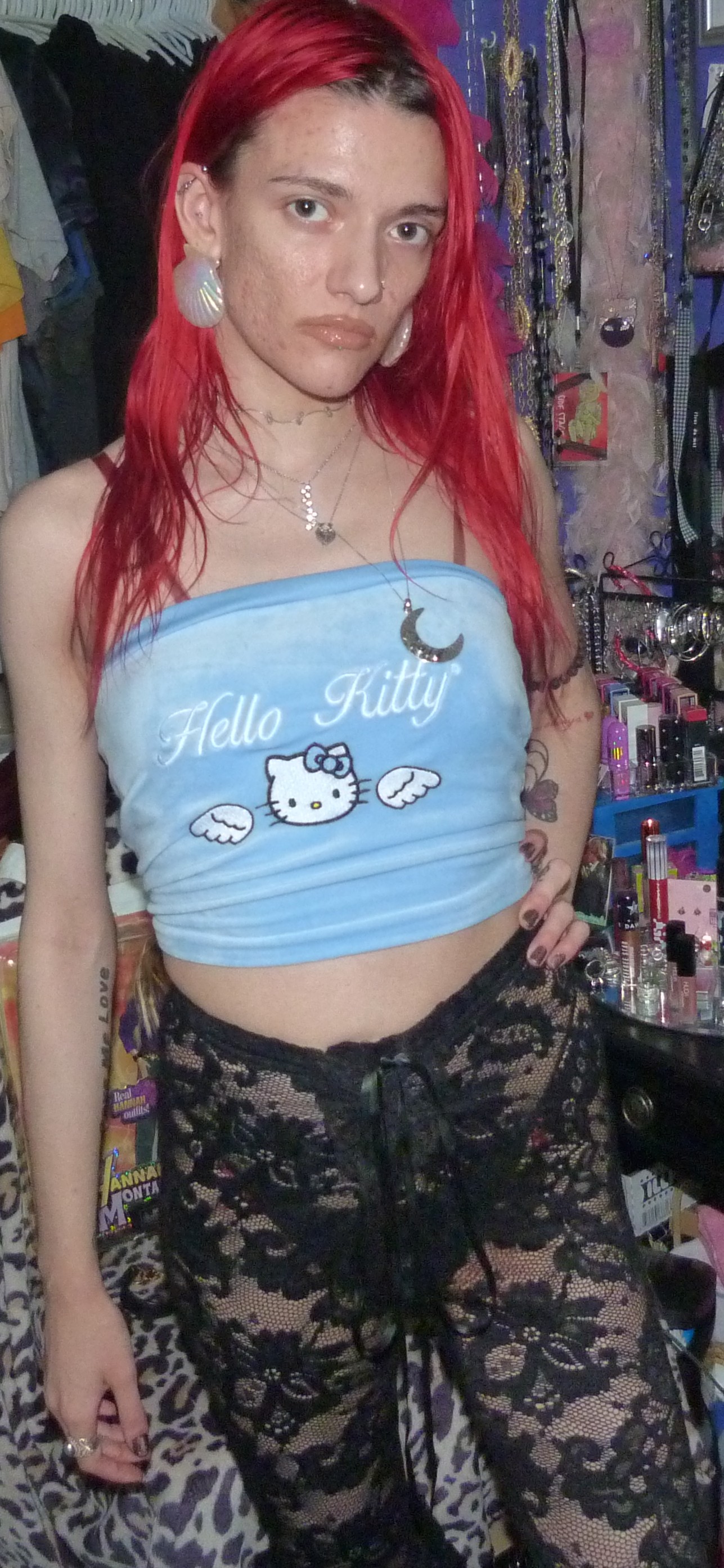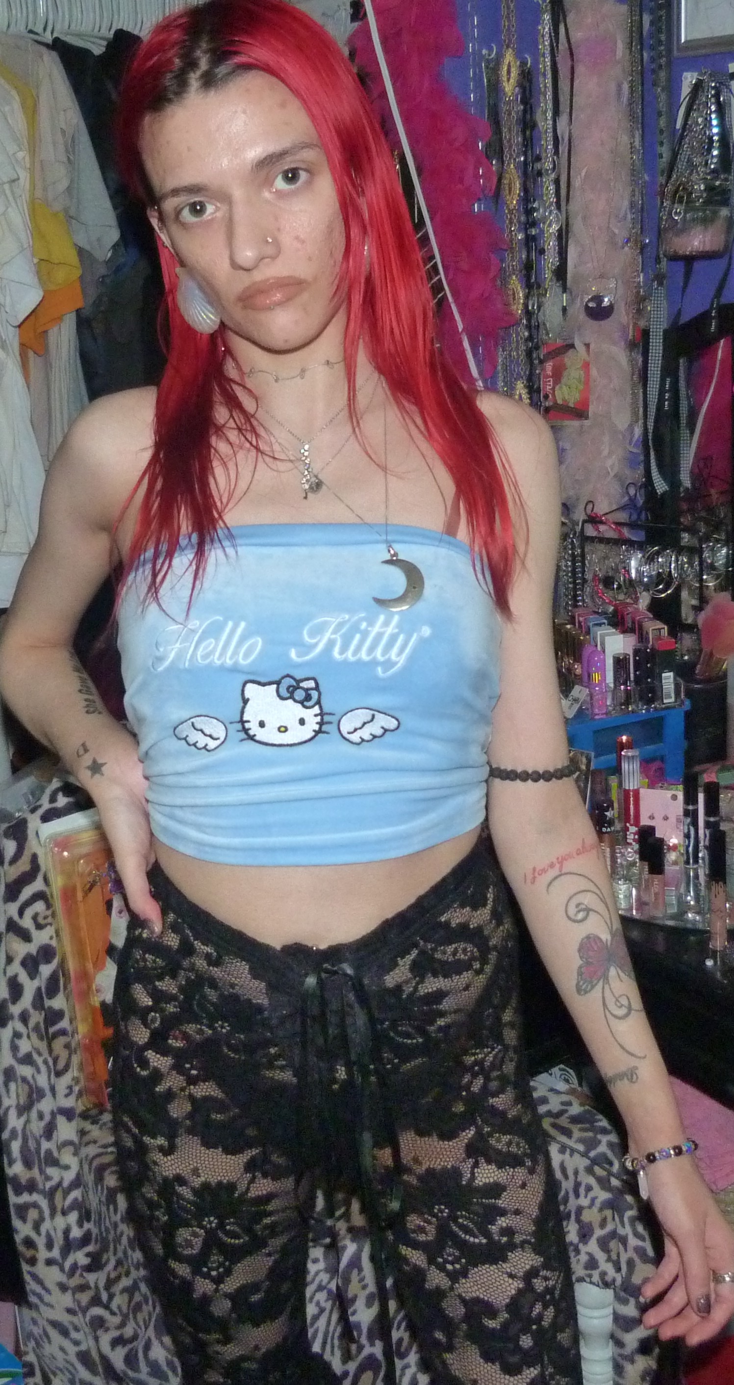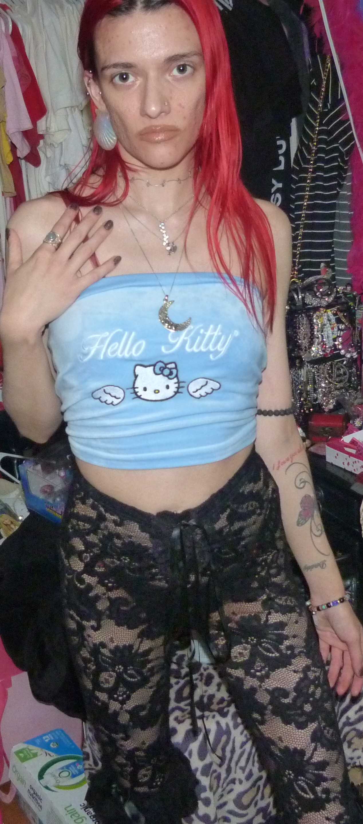 HELLO KITTY ANGEL BLUE SHIRT WITH BARBIE: THE MOVIE SEASHELL EARRINGS FOR THIS CUTE OUTFIT I WORE TODAY! WITH MY BRIGHT RED HAIR + + I LOVED THIS LOOK SO MUCH!