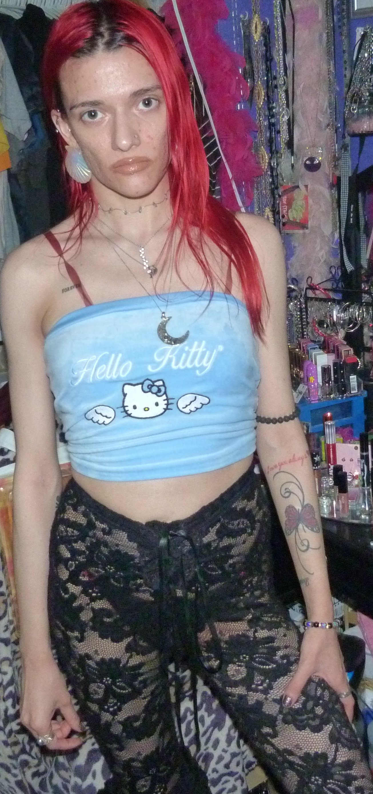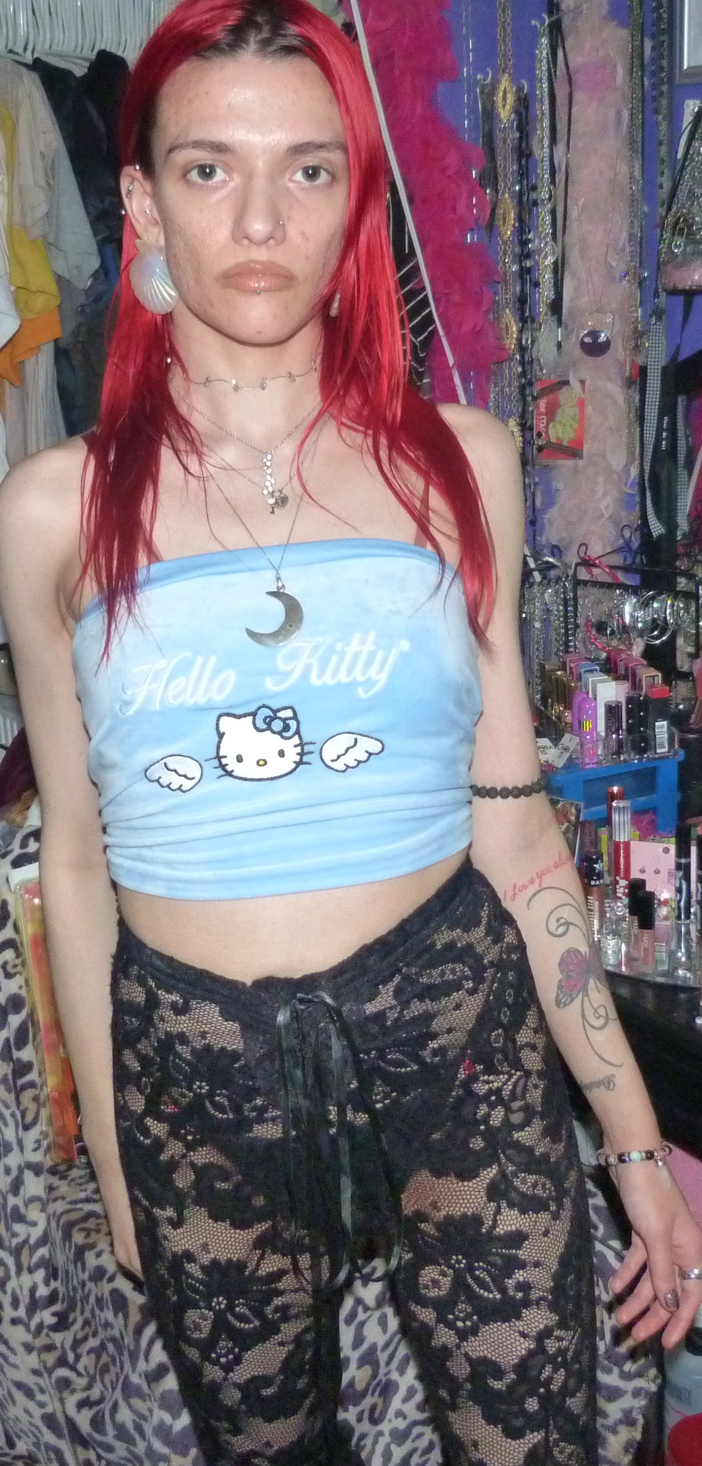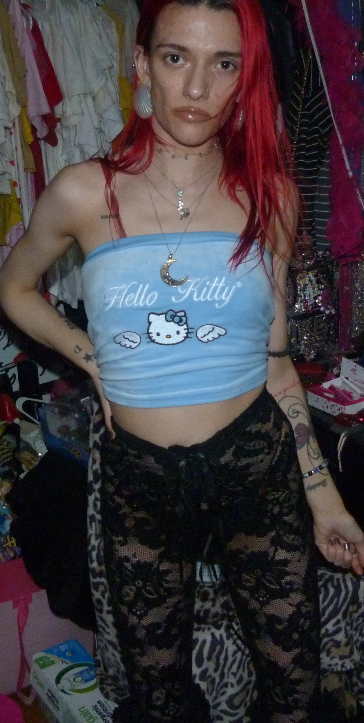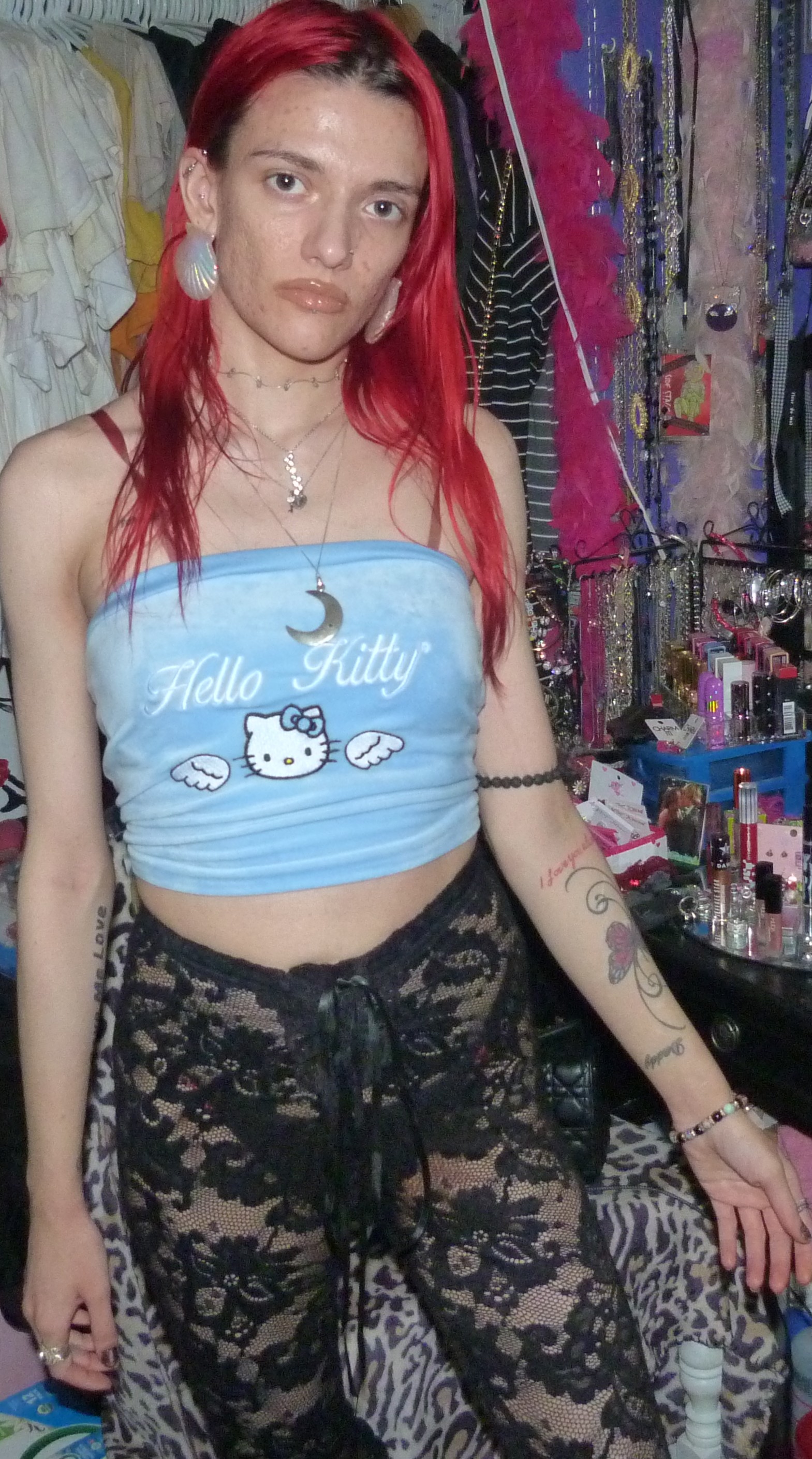 HELLO KITTY ANGEL BLUE SHIRT WITH BARBIE: THE MOVIE SEASHELL EARRINGS FOR THIS CUTE OUTFIT I WORE TODAY! WITH MY BRIGHT RED HAIR + + I LOVED THIS LOOK SO MUCH!