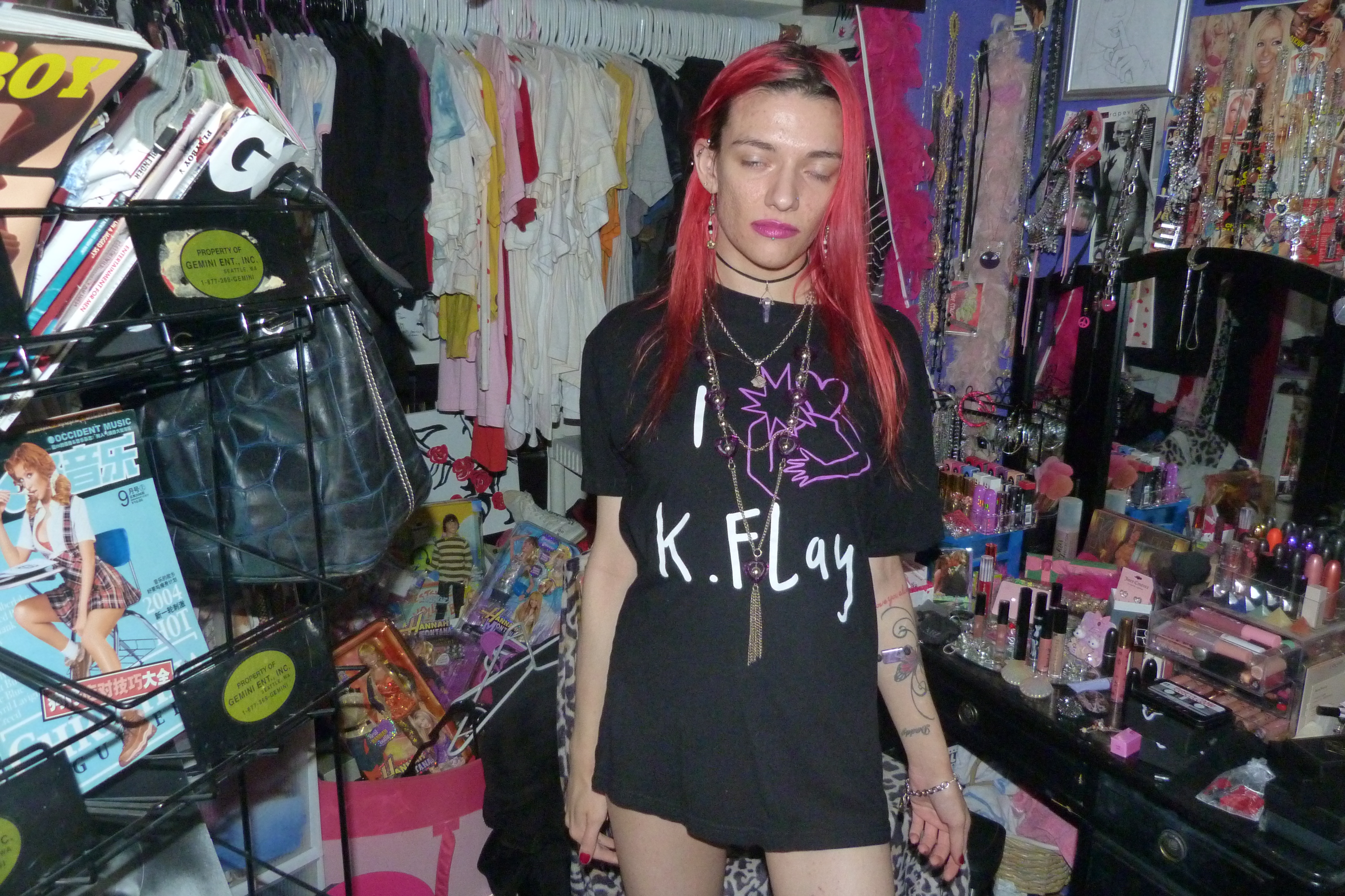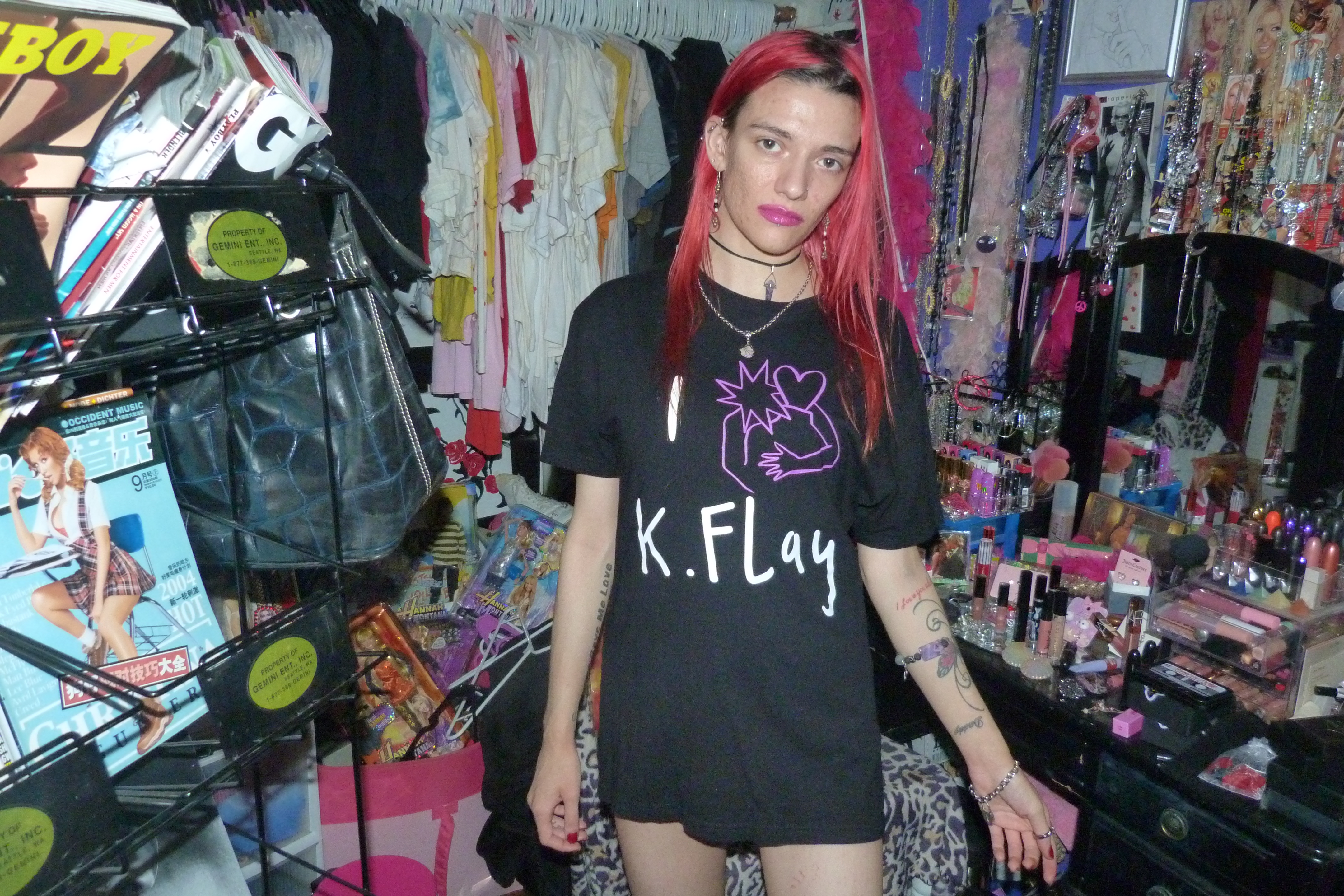 IT’S AN AWESOME T-SHIRT, K.FLAY IS SUPER AWESOME. THE SHIRT SAYS I LOVE K.FLAY., MY LIPSTICK IS VIOLETTA FROM THAT JEREMY SCOTT X MAC COSMETICS LIP PALETTE, OF 2018!