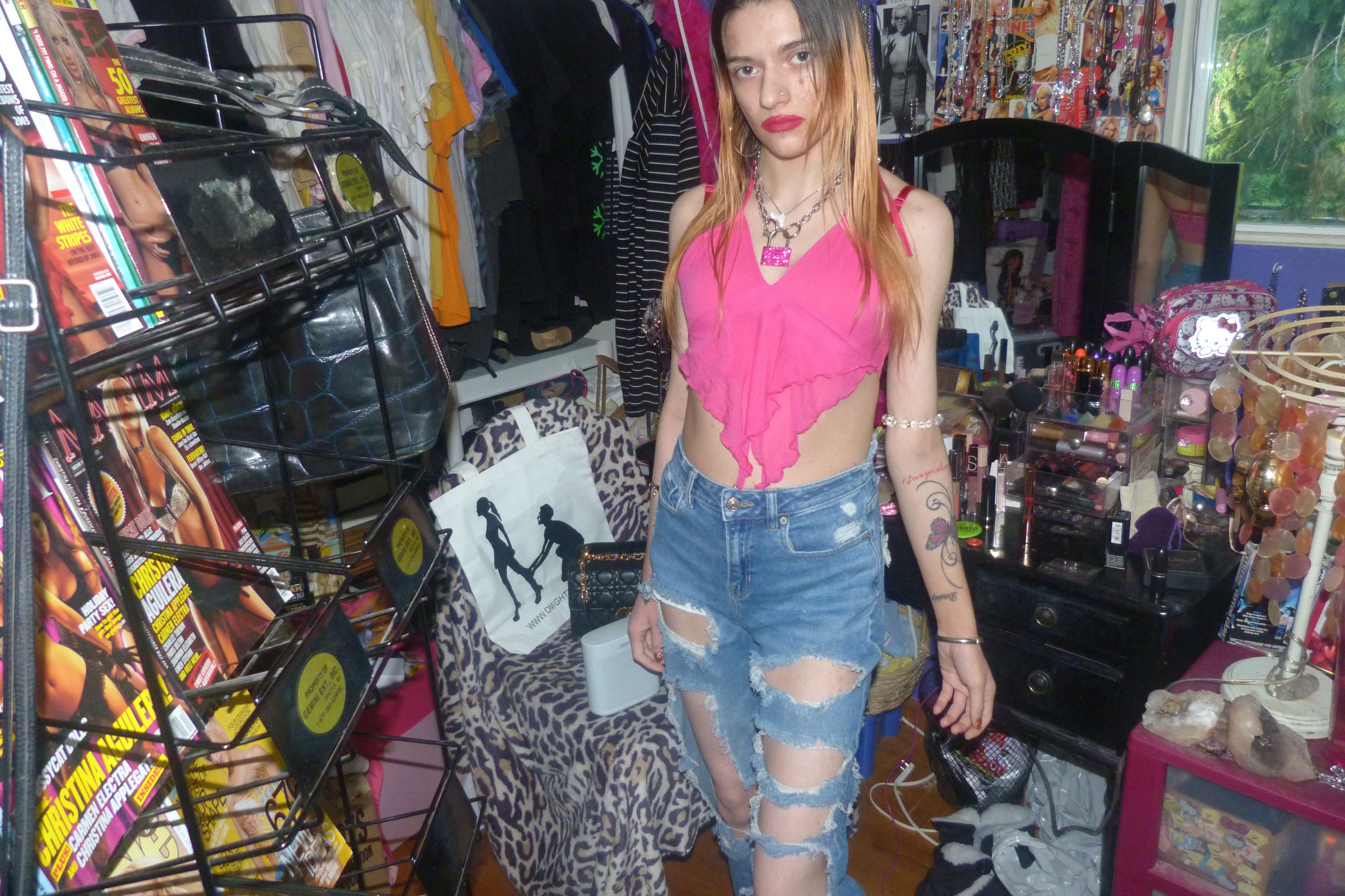 The very first time I saw this trend, Kylie Jenner was rocking it. I’ll include that picture. Anyway, at first I thought it was really dumb. Then I realized it was kind of cool…Like wildfire that trend did spread, being interpreted by a million different people in infinite ways. It wasn’t until now, 4 months later, finally got my chance to fw this trend! I got a big bag of used clothing and had my mind set on re-creating this trend in my own way, so I started snip snip snipping away. Got some really controversial results, but the main one is one I call Epic.